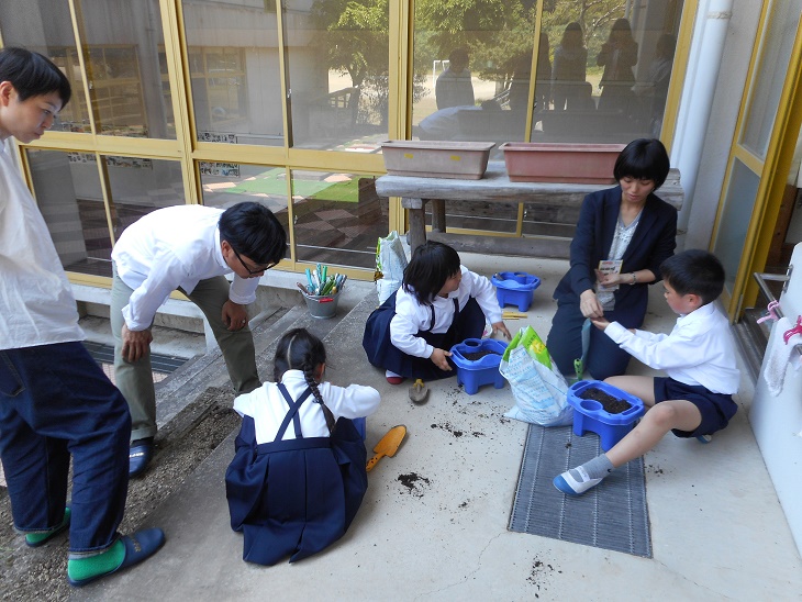 1・2年生が合同で生活科の学習を中庭でしていました。