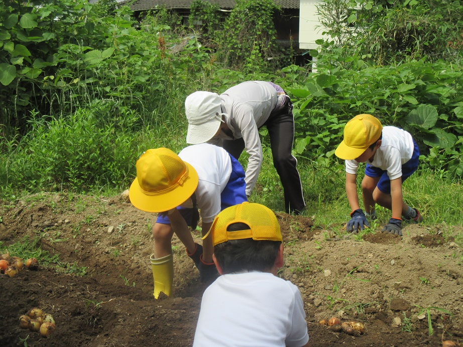 5月22日(火)、5校時に、全校児童でサラダ玉ねぎを収穫しました。