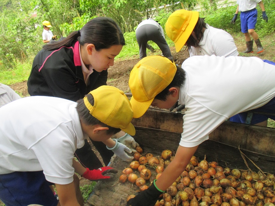 事前にたんぽぽ・ひまわり学級の子供たちが草取り等の準備をしてくれていたので、この時間は、黒いビニルをはがして、宝探しのように土を手で掘り進めて行きました。小ぶりでしたが、とても美味しそうな玉ねぎがたくさん収穫できました。