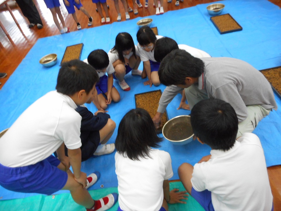 5月8日(火)、戸次さんにご協力いただいて、全校児童でもみ蒔きをしました。今年ももち米を蒔いて、秋のふれあい感謝祭にもちつきをしたいという楽しい計画があります。1年生は初めての体験で、興味津々の様子でした。