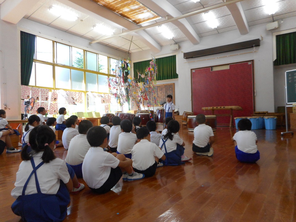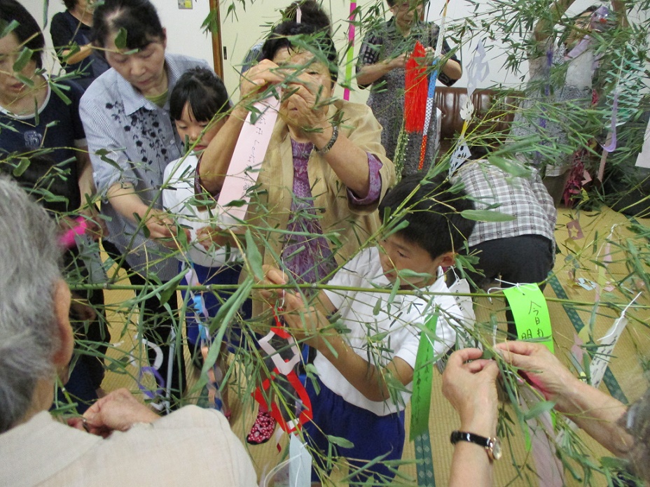 7月6日(金)、1・2年生を中心に温泉センターへ出かけてひまわり会の方々と七夕飾りつけをしました。