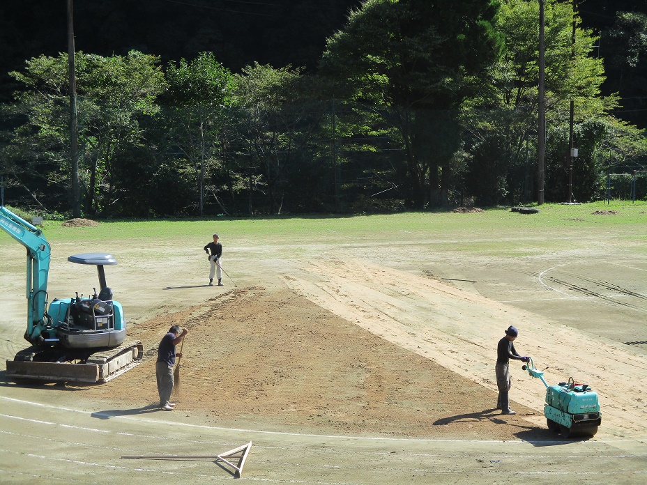 教頭先生や用務員の先生はじめ、職員ががんばって草取りや草刈りを行いました。そして、今日は、シルバー人材センターからも応援にきてくださって、ご覧の通り「草色」の運動場から「土色」の運動場に見違えるようにきれいになりました。
