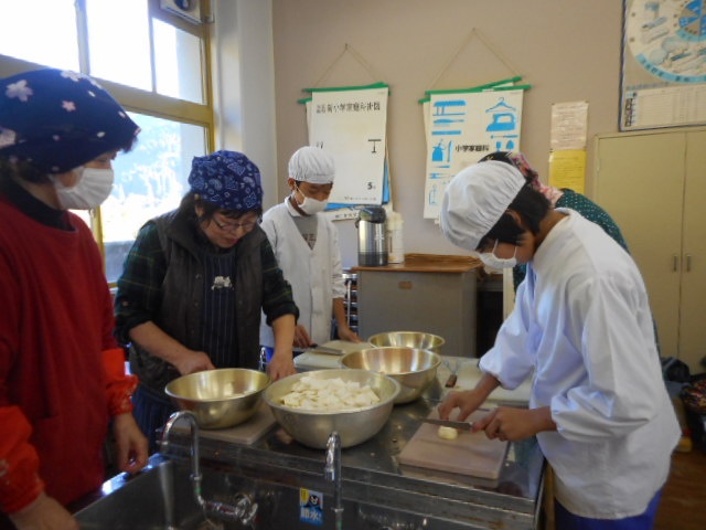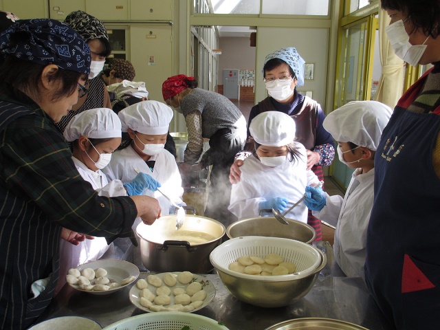 婦人会の皆さんに教えていただきながらだご汁を作りました。具材と一緒に愛情もたっぷり入れましたよ。