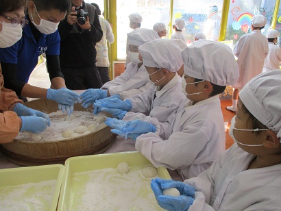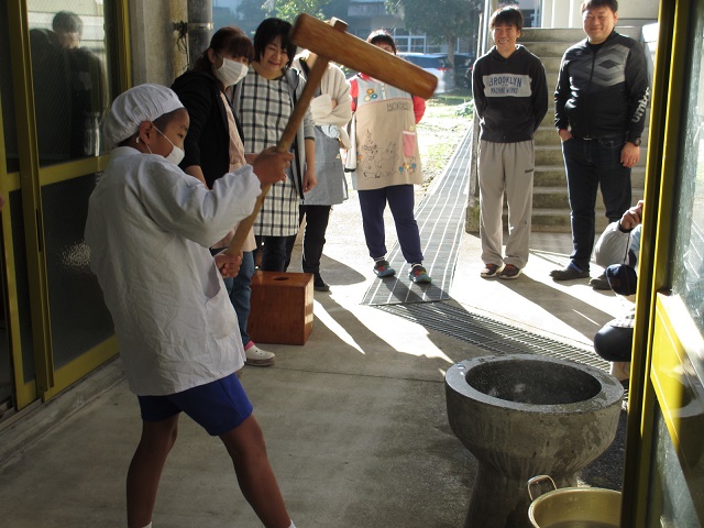 一人一人がもちをつきました。そして、みんなで柔らかいフワフワのお餅を丸めました。