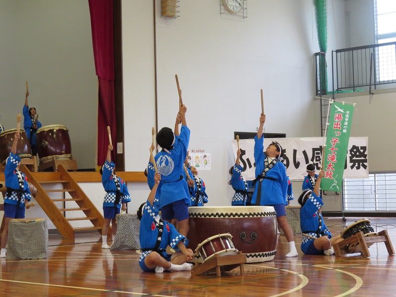 ステージの部は、子供たちの「ありがとうの約束」の歌と「湯出っ子七滝太鼓」。