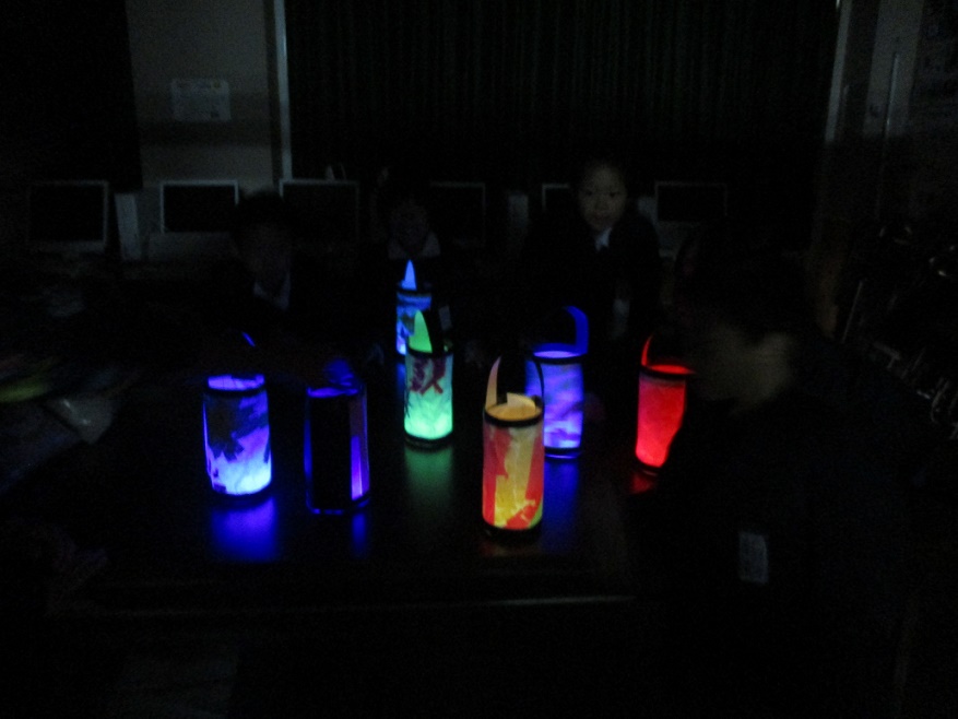 暗幕を引いた視聴覚室で、きれいに浮かび上がったランタンです。