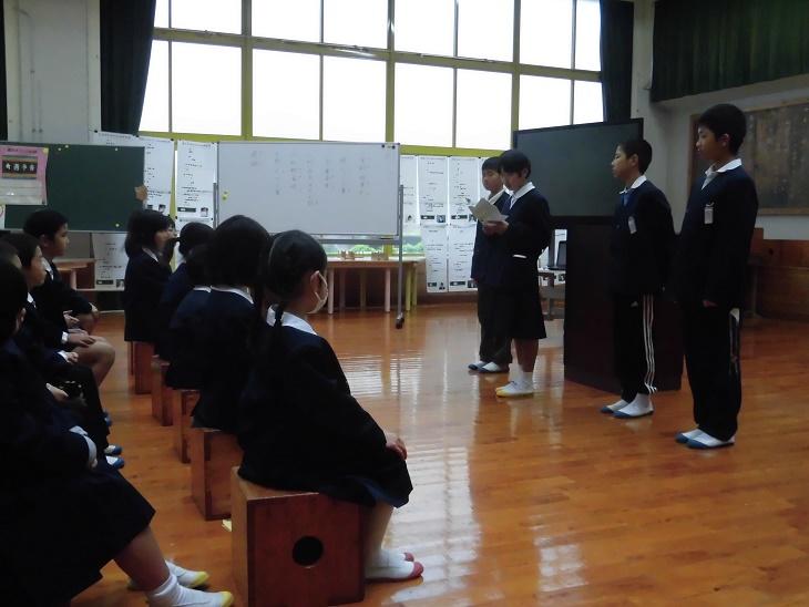 3学期の始業式。2年、4年、6年生が冬休みの思い出と3学期の抱負を堂々と発表しました。