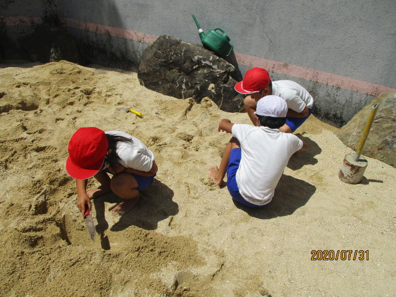 長く「鯉の池」として親しまれてきた児童玄関前の池ですが、2年前、突然全滅したという悲しいことがありました。そして、今回、そこが砂場として生まれ変わりました。さっそく1・2年生が楽しそうに遊びました。
