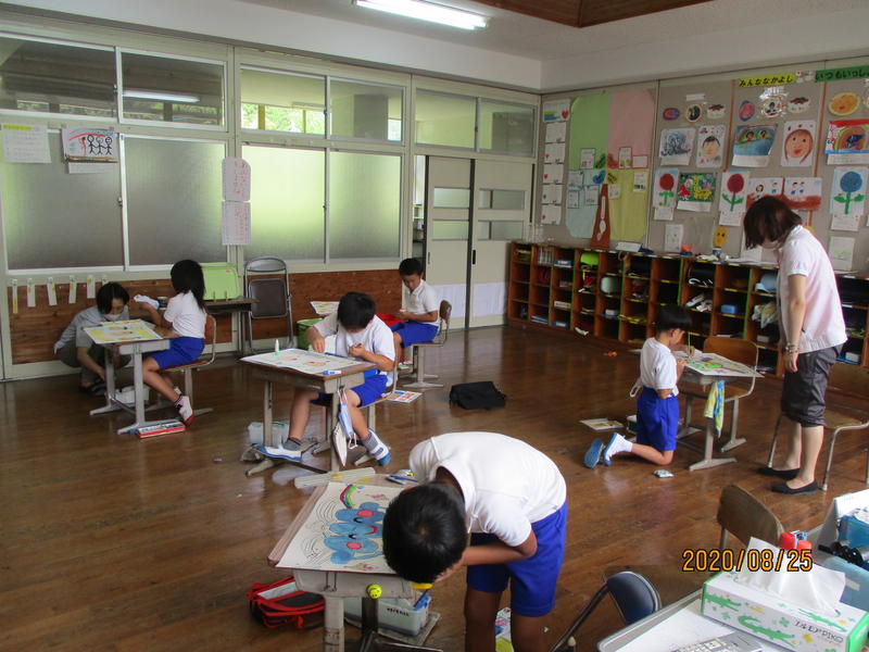 これは、1・2年生の図工の様子。それぞれおもいおもいにポスター作りに取り組んでいます。
