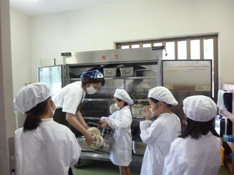 2学期になり、2日目ですが、昨日から給食が始まっています。子供たちは、おいしい給食を食べて、下校します。写真は、1・2年生の給食の準備の様子です。食缶を配膳室に取りに来て、教室で注ぎ分けます。全ての準備を自分たちでします。