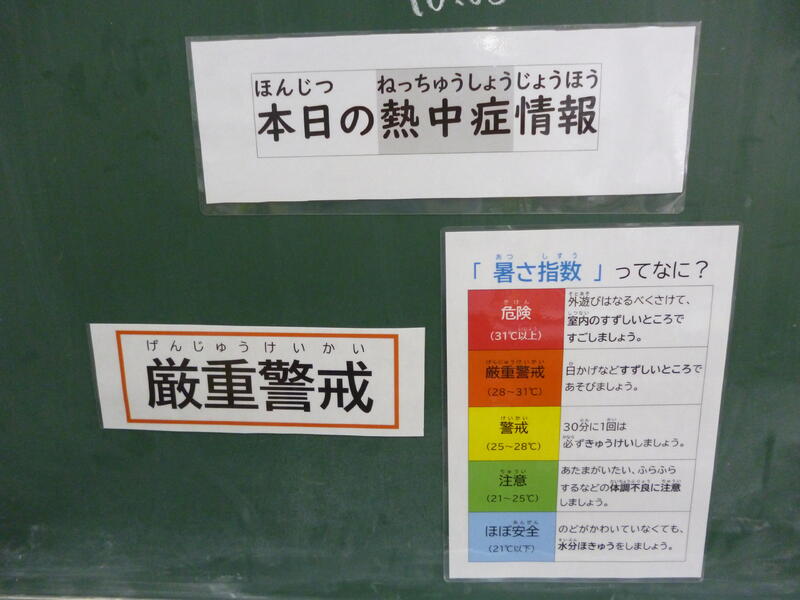 今年の夏の暑さは例年にない暑さになりました。明日から9月、少しは涼しくなってくれるといいのですが、まだまだ厳しい暑さが続きそうです。その厳しい暑さに対して子供たちの活動をどうするか、職員室の前方の黒板に、養護教諭から熱中症に注意するよう「本日の熱中症情報」が毎日示されています。
