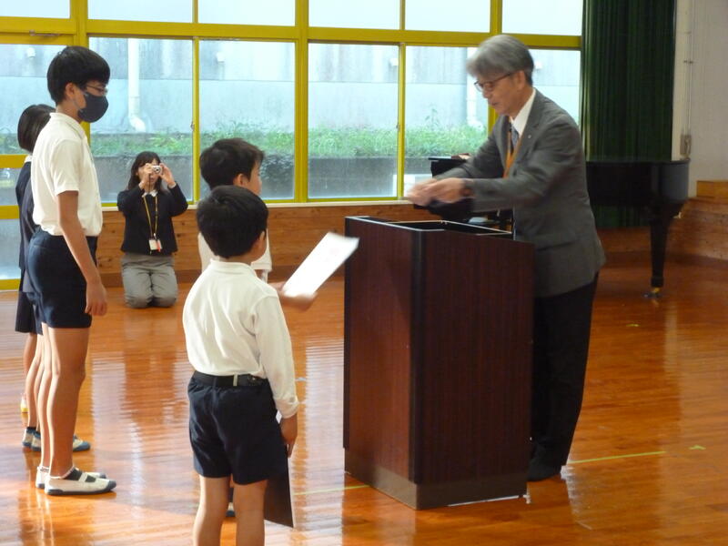 全校集会において、今年度1回目の通知表授与を行いました。昨年度までは、それぞれの学期の最終日に通知表を渡していましたが、今年度から年に2回、10月と3月に渡すようになりました。このことで、子供たちの様子をしっかりと見て評価することができ、また、学期末に子供たちも教師もお互いにゆとりをもって過ごせ、いろいろな行事等も計画することができます。