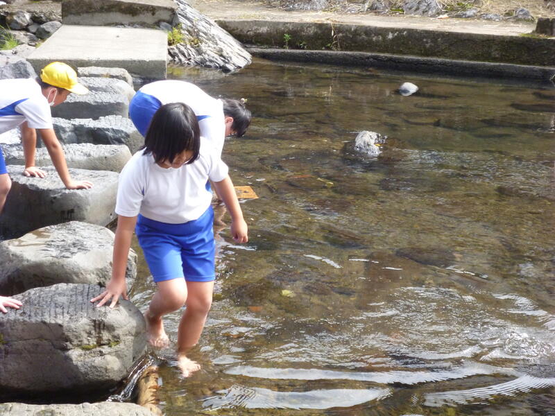 湯出の川に出かけて行き、水の流れる様子を観察しました。帰りに、ちょっとだけ足湯にも浸かりました。