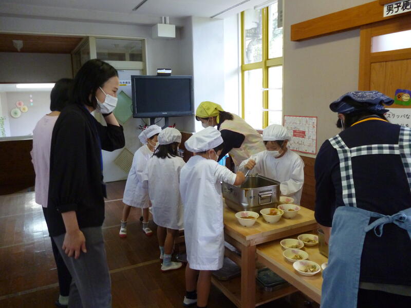 水俣市給食センターから2名の栄養教諭が来校され、子供たちの給食の様子(配膳から片づけまで)を見学されました。