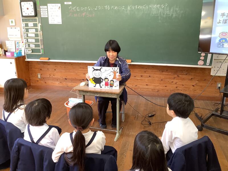 12月13日、養護教諭による保健指導が1・2年生教室でありました。今回は、感染症が流行するこの季節に、「かぜをひかないようにするためにどうすればいいか」を考えました。予防のための手洗いの実践も行いました。