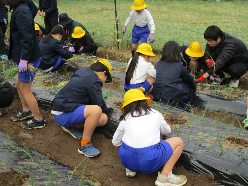 12月18日(月)、5校時に全校児童でサラ玉の苗植えを行いました。地域の方、JAの職員の方に来ていただき、植え方を教えていただきました。来年の5月くらいに収穫できる予定です。