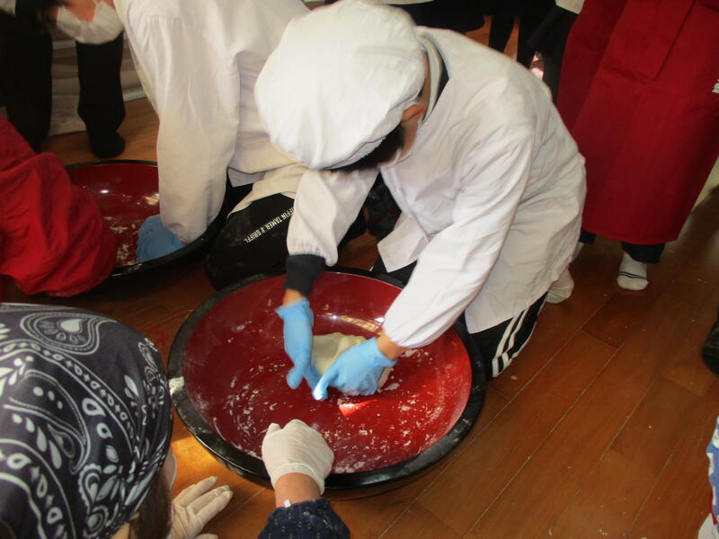 1月29日(月)、全校児童で頭石(かぐめいし)に出かけて行き、地域の方々のご指導のもと、そば打ちを体験させていただきました。初めてそば打ちをする児童がほとんどで、そば粉をこねて、のばして、切るという作業を慣れない手つきではありましたが、楽しみながらおこないました。最後に打ち立てのそばを茹でていただき、美味しく食べました。