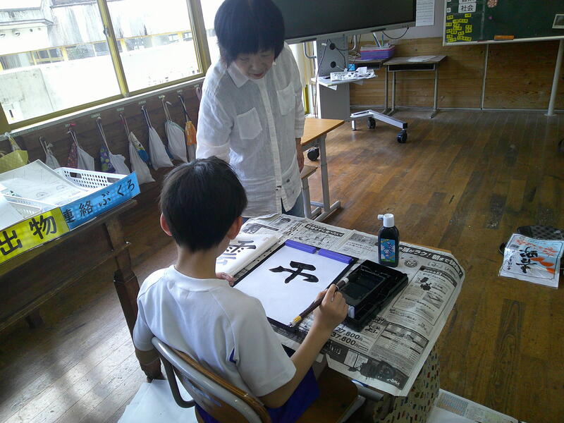 3・4年生の書写の授業時間に、地域の外部支援として荒木先生を招きお力をいただいています。専門でもあられることもあり、懇切丁寧にご支援いただいています。児童はもちろんのこと担任にとってもよき学びとなっています。