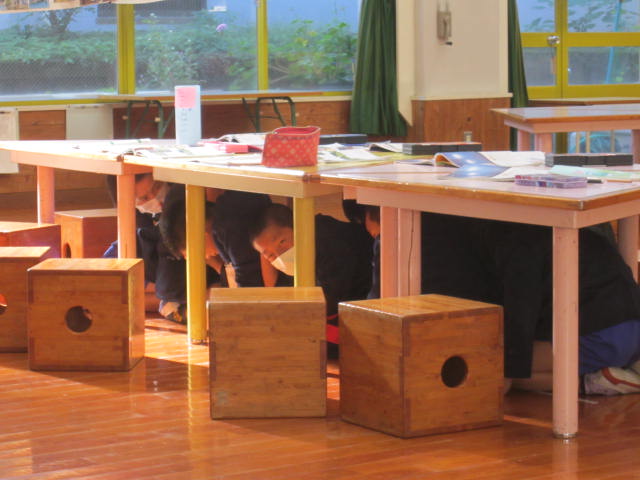 11月4日(金)地震避難訓練を行いました。緊急地震速報の音を流して、動き方を確認しました。ゆれがおさまるまで机の下等に隠れて、頭を守りました。行動はすばやくできましたが、少し話し声が聞こえました。次は、予告なしの集合訓練を行う予定です。