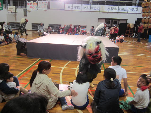 11月8日(火)本校体育館で、東京の民族歌舞団「荒馬座」の公演がありました。地域の方もたくさんご来場いただき、子どもたちとともに、日本の祭りを楽しみました。獅子舞にかまれたり、一緒に体を動かしたりと、あっという間に時間が過ぎました。最後は、一緒に2001水俣ハイヤ節を踊りました。本物の芸能に触れることができてとても良かったです。