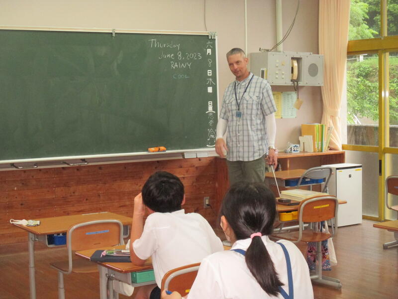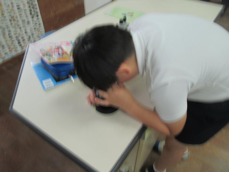 さて、今日は、高学年の学習の様子です。6年生は外国語支援員と一緒に外国語の学習、5年生は教頭先生と一緒に理科(メダカの卵の観察)の学習です。