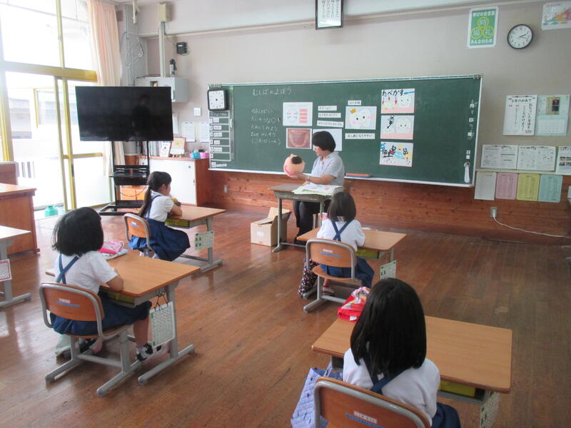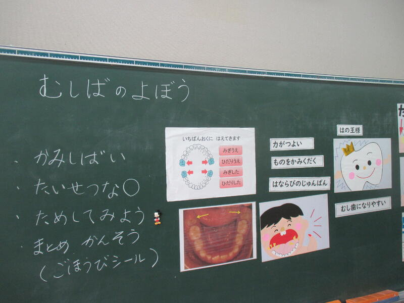 6月9日(金)5時間目、1・2年生の学活の時間に、担任と養護教諭によるティームティーチングで虫歯予防についての授業がありました。虫歯にならないためにどうすればいいかをしっかり学びました。