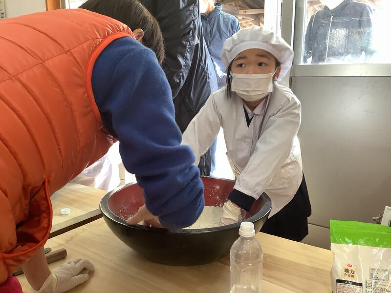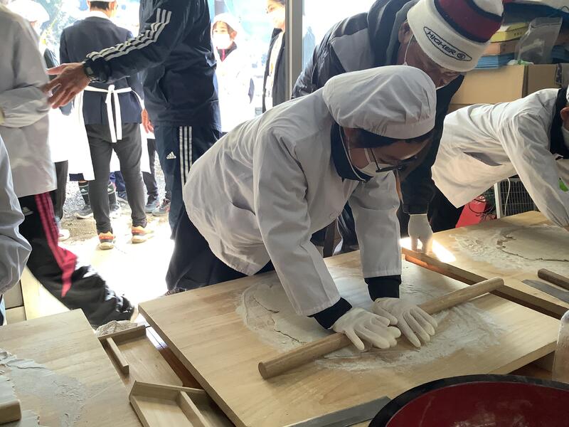 1月30日(金)に、湯出地区の「ゆずり葉」の皆様のご支援を得てそば打ち体験を行いました。自分たちで種まき、収穫を行ったそば粉でそばを打ち、みんなでおいしくいただきました。みんなで食について考え、楽しむ時間となりました。