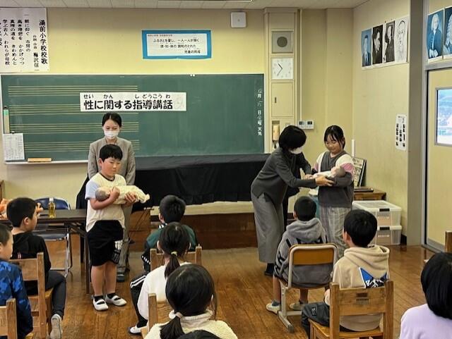 代表の児童は、赤ちゃん抱っこ体験(2年生、