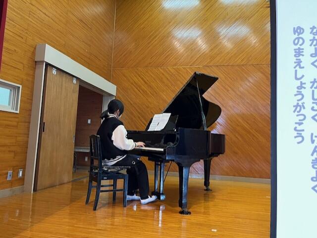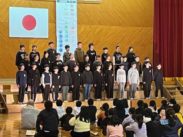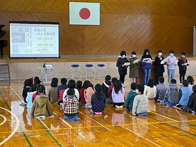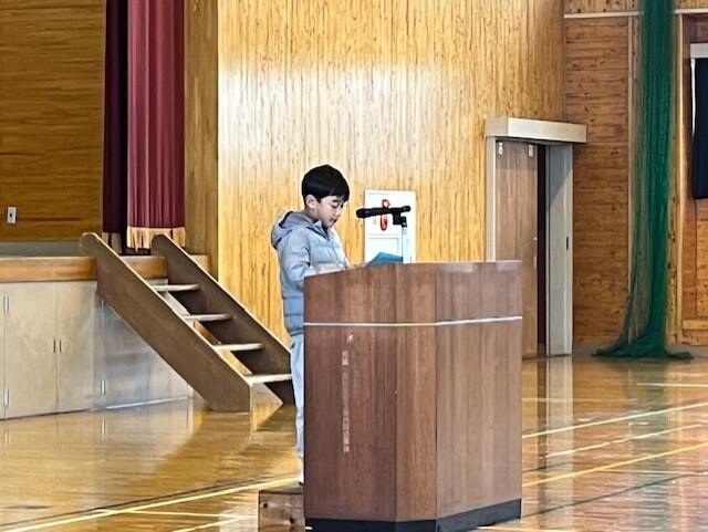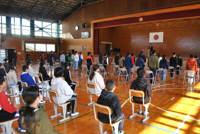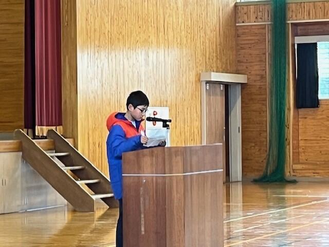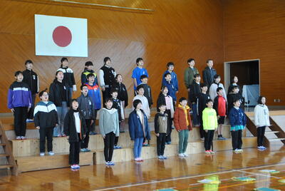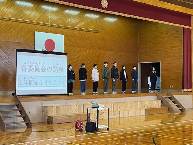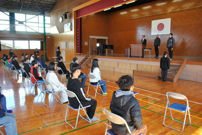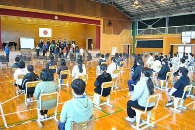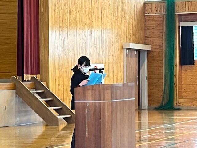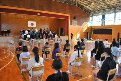 式では、学年代表の発表や校歌斉唱があり、