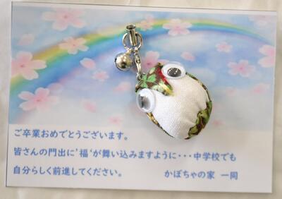 キーホルダーを卒業生と学校職員にいただきました。