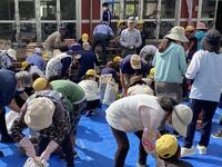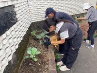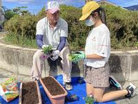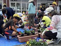 まず最初は、老人クラブの方と5年生が協力してプランターに花の苗を植えていきました。はじめはうまくいかなかった子どもたちでしたが、老人クラブの皆さんの手ほどきを受けて次第に上達していきました。