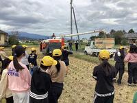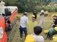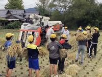 初めは慣れない手つきでなかなか進まない子どもたちでしたが、コツをつかむとどんどんスピードアップ。額に汗を浮かべながら、みんな一生懸命取り組んでいました。また、途中からはコンバインも登場し、あっという間に作業が完了。機械化、省力化のメリットもしっかり感じたようでした。