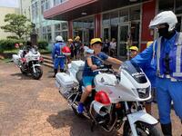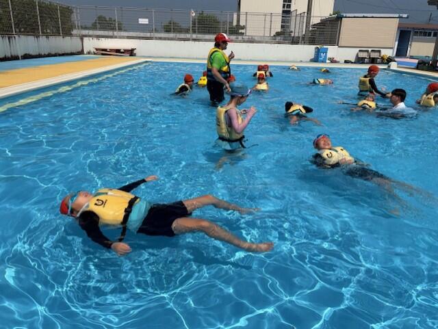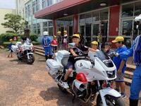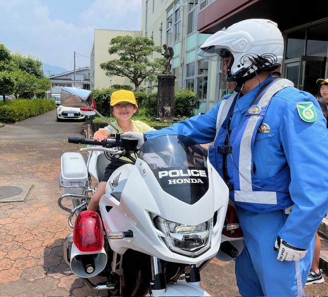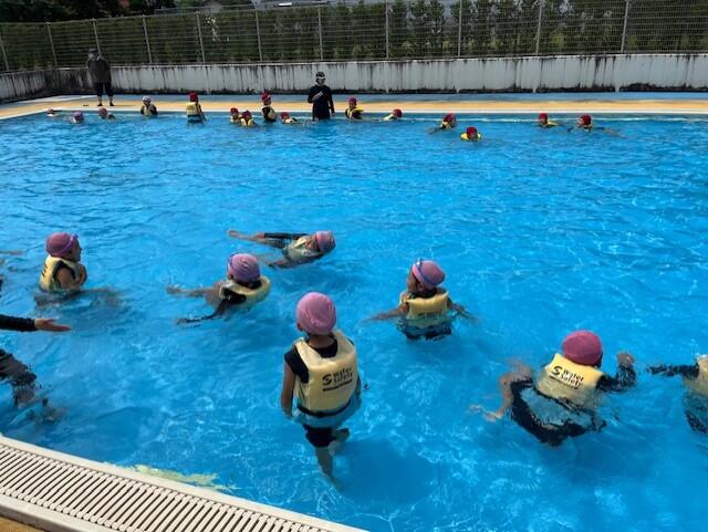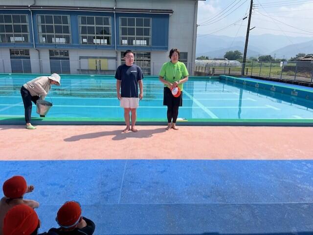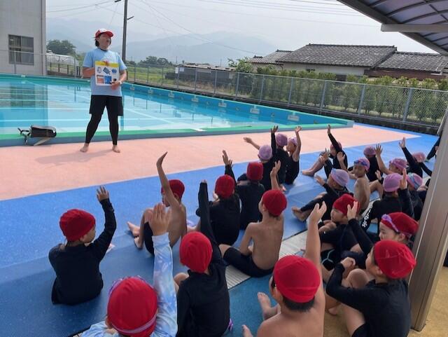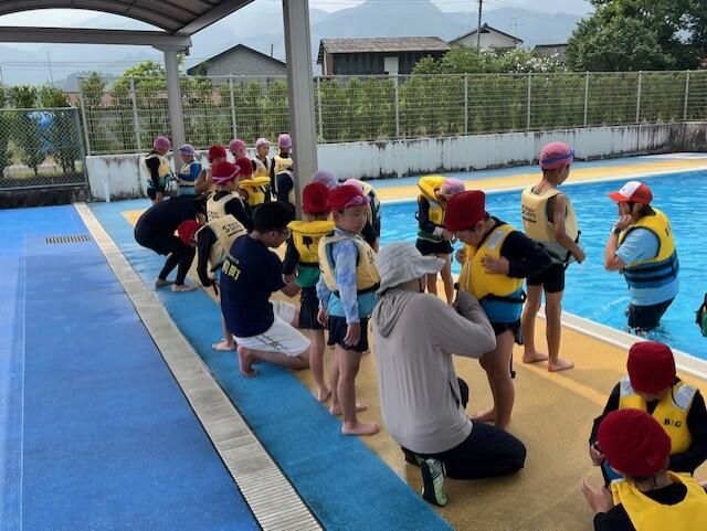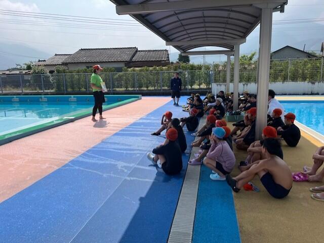避難後は上球磨消防署東分署の署員の方からお話を伺ったり、消火器の使い方の説明を聞いたりしました。水消火器を使って実演訓練もしました。いざという時の備えとして大事なことですが、その前に「火を子どもだけで扱わないこと」「火事を見かけたら大きな声で近くの大人に知らせること」もしっかり覚えておいてほしいですね。