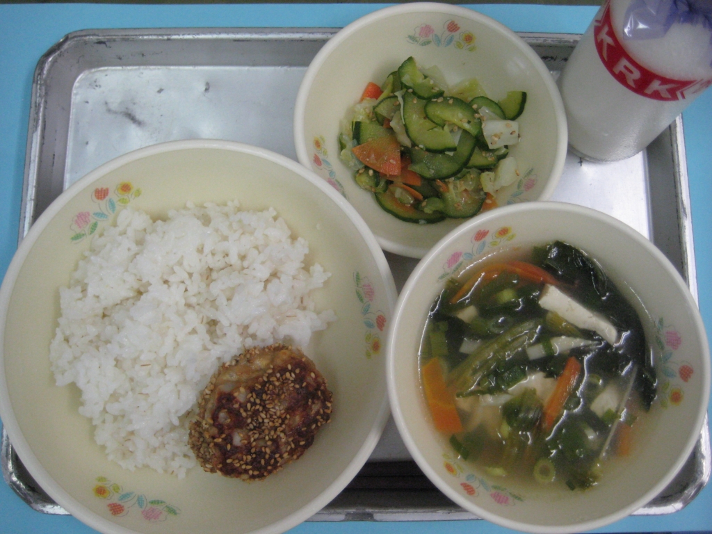 2013年9月3日 投稿日時 : 2013/09/03 ei/ho ☆ 麦ご飯 ☆ 豆腐の五目スープ ☆ ごまつくね焼き ☆ きゅうりのレモン和え 今日は、ごまをたくさん使った「ごまつくね焼き」です。ごまは、血管をじょうぶにし、生活習慣病をふせぐ働きがあります。
