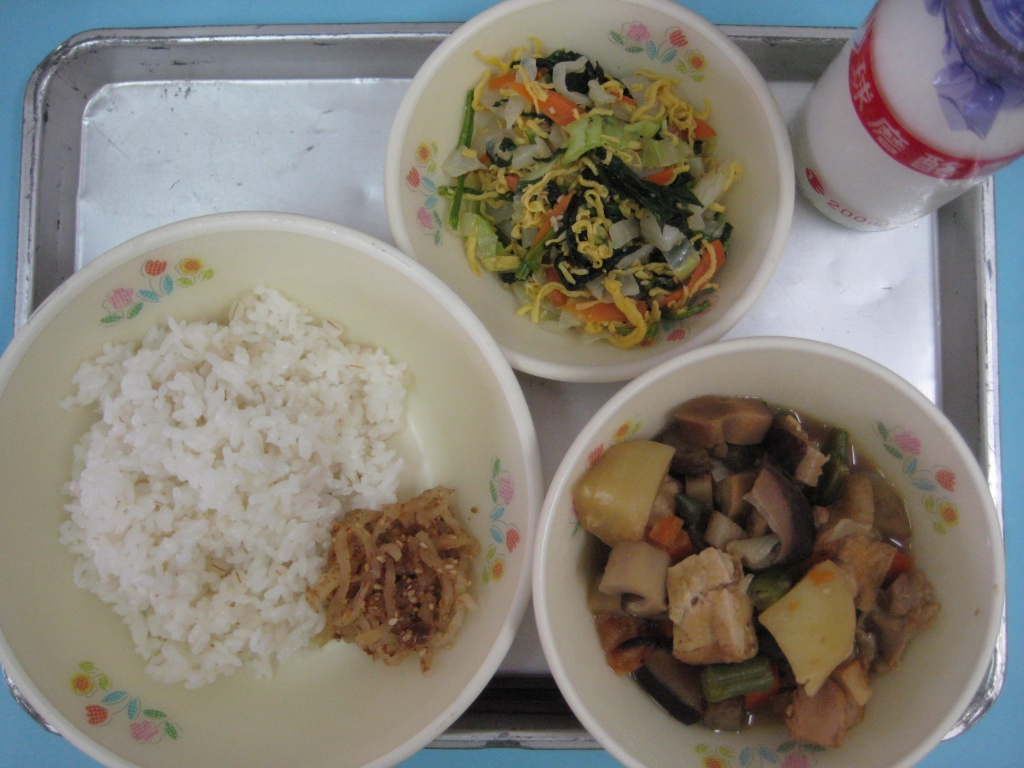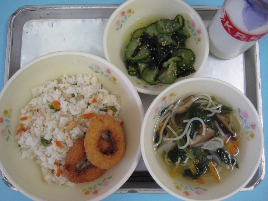 2013年9月5日 投稿日時 : 2013/09/05 ei/ho ☆ カルカルご飯 ☆ 魚そうめん汁 ☆ イカリングフライ ☆ きゅうりとわかめの酢の物 カルカルご飯は、大豆とちりめんじゃこを使った混ぜご飯です。大豆やちりめんじゃこには、骨や歯をじょうぶにするカルシウムがたっぷりふくまれています。