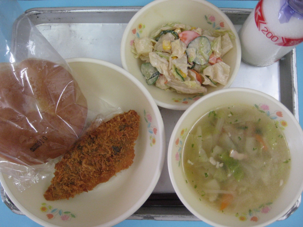 2013年9月11日 投稿日時 : 2013/09/11 ei/ho ☆ まるパン ☆ 野菜スープ ☆ 白身魚フライ ☆ オーロラサラダ 今日は、パンに白身魚フライとサラダをはさんで食べる「セルフバーガー」です。ハンバーガーなどを食べるときは、野菜サラダや野菜スープなどを付け合わせにして、野菜が不足しないようにしましょう。