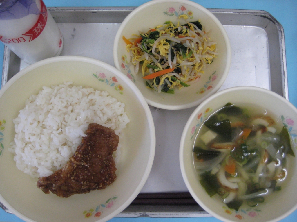 2013年9月17日 投稿日時 : 2013/09/17 ei/ho ☆ 麦ご飯 ☆ わかめスープ ☆ 豚肉のプルコギ- ☆ もやしのナムル 今日は3連休明けで、運動会全体練習があったので、みなさんの疲れをとり、食欲がわくようなメニューにしました。 「プルコギー」とは、韓国の料理で、薄切り肉を、野菜と一緒に甘辛く味付けた料理です。給食では、厚めの豚肉を揚げ、ねぎとにんにくのきいたタレをかけています。