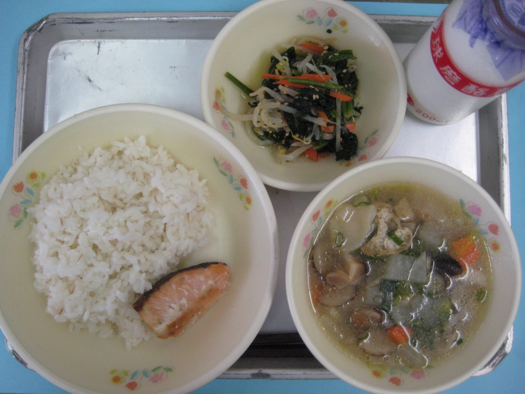 2013年9月20日 投稿日時 : 2013/09/20 ei/ho ☆ 麦ご飯 ☆ 団子汁 ☆ 鮭の塩焼き ☆ ごま和え 今日は、和食の日です。 ご飯と汁物、おかずが二品の食事内容を「一汁二菜」と言います。このようにご飯とおかずを組み合わせると、栄養バランスがとりやすいです。