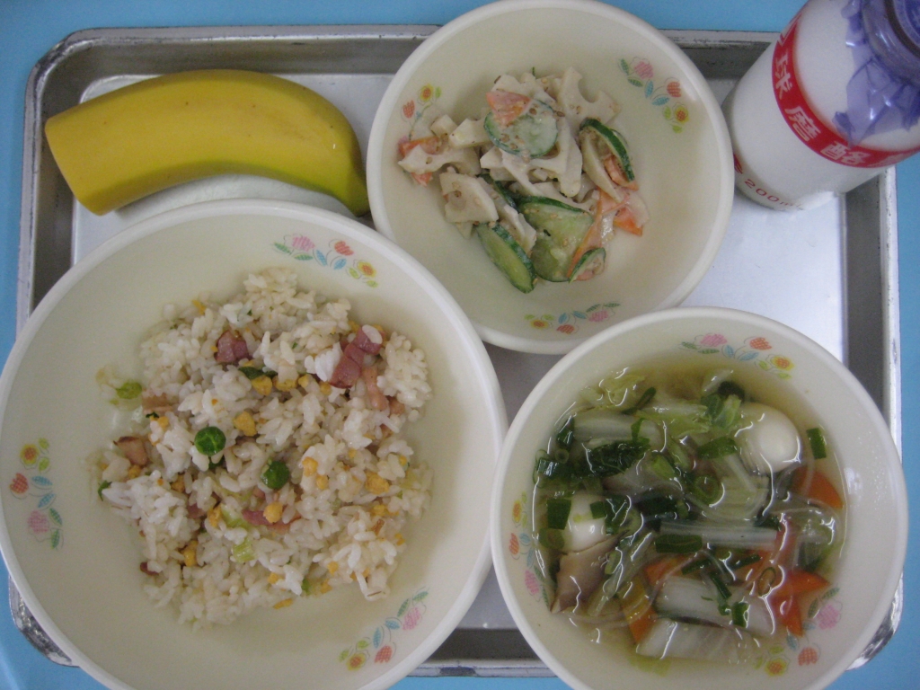 2013年10月3日 投稿日時 : 2013/10/03 ei/ho ☆ チャーハン ☆ うずら卵のスープ ☆ れんこんときゅうりのごまだれ ☆ バナナ 「れんこんときゅうりのごまだれ」は、かみごたえのある“かみかみメニュー”です。よくかむと、歯並びが良くなったり、むし歯を予防するなどの効果があります。