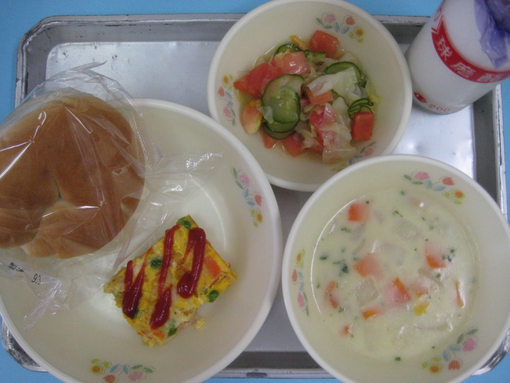 2013年9月4日 投稿日時 : 2013/09/04 ei/ho ☆ 米粉パン ☆ クラムチャウダー ☆ スパニッシュオムレツ ☆ トマトサラダ クラムチャウダーは二枚貝のクリームスープのことです。給食では「あさり」をたくさん使います。あさりには、成長期に必要な鉄分がたっぷりで、血液を作る材料にもなります。