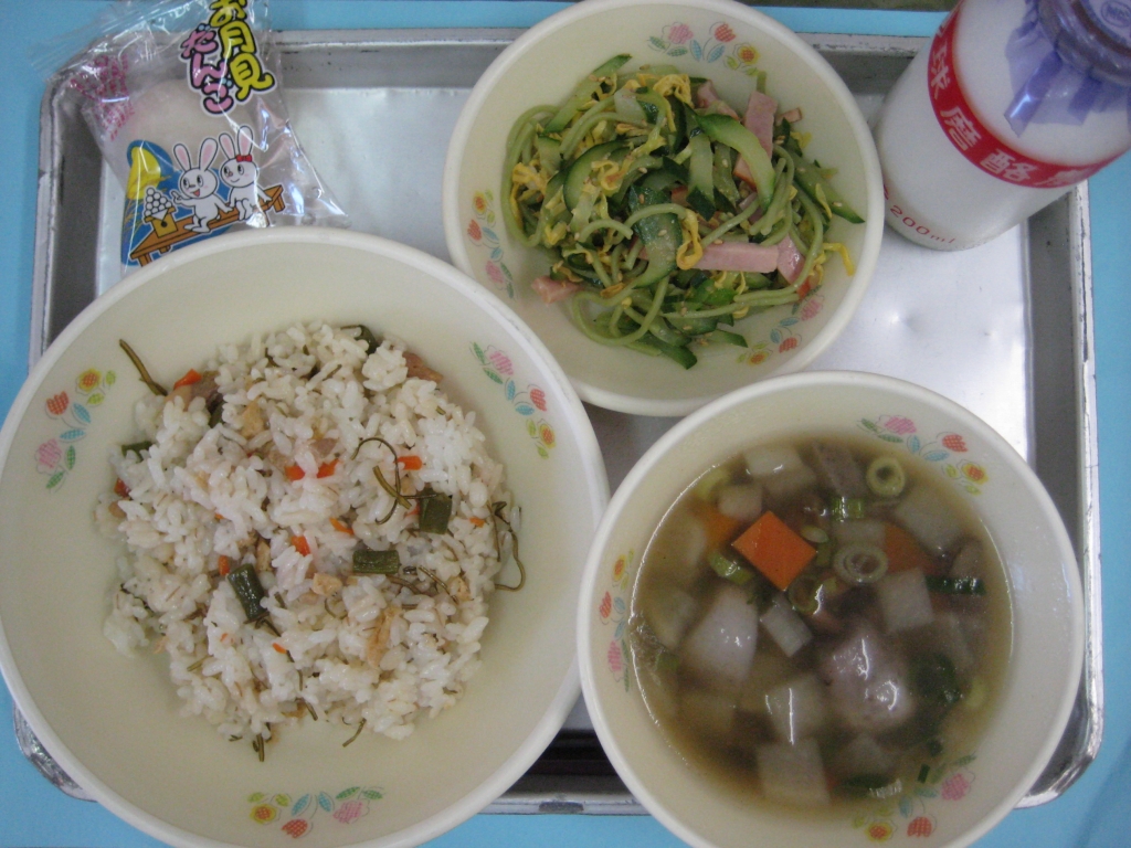 2013年9月5日 投稿日時 : 2013/09/05 ei/ho ☆ カルカルご飯 ☆ 魚そうめん汁 ☆ イカリングフライ ☆ きゅうりとわかめの酢の物 カルカルご飯は、大豆とちりめんじゃこを使った混ぜご飯です。大豆やちりめんじゃこには、骨や歯をじょうぶにするカルシウムがたっぷりふくまれています。
