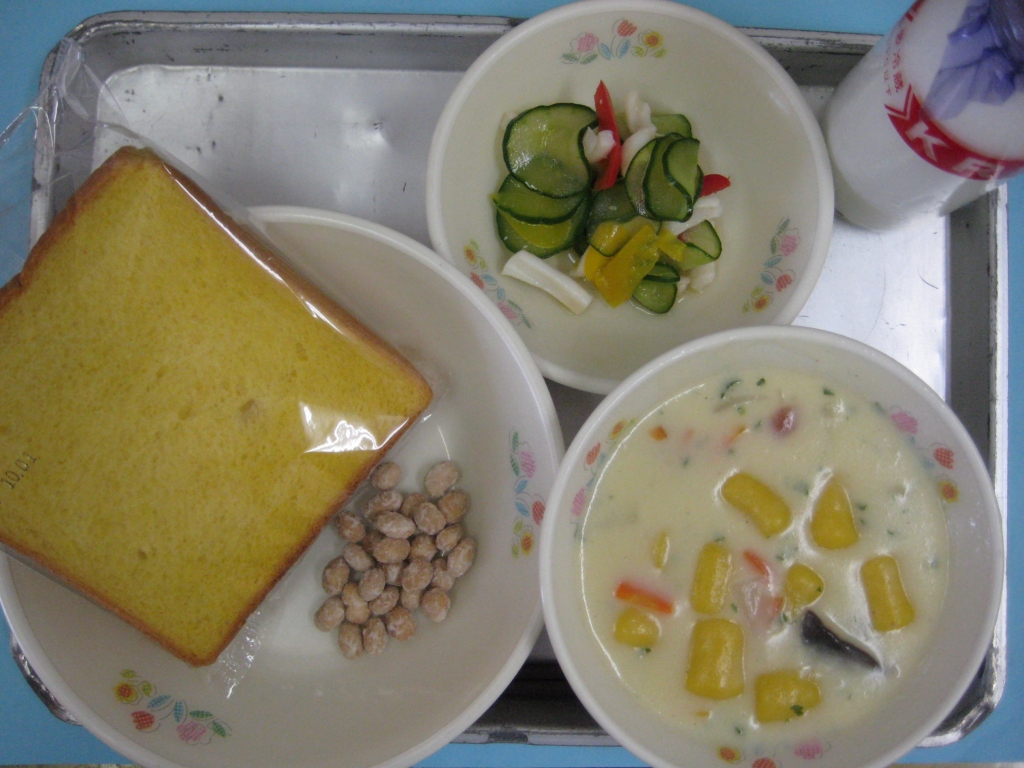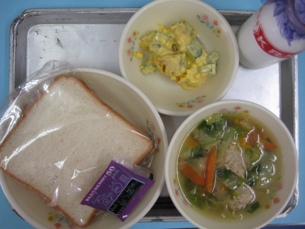 2013年10月10日 投稿日時 : 2013/10/10 ei/ho ☆ 食パン ☆ キャベツと肉団子のスープ ☆ かぼちゃコロコロサラダ ☆ ブルーベリージャム 今日10月10日は、「目の愛護デー」です。”ビタミンA”を多くふくむかぼちゃ、にんじん、”アントシアニン”を多く含むブルーベリーなど、今日の給食には、目の健康を守る栄養素がたっぷりつまっています。