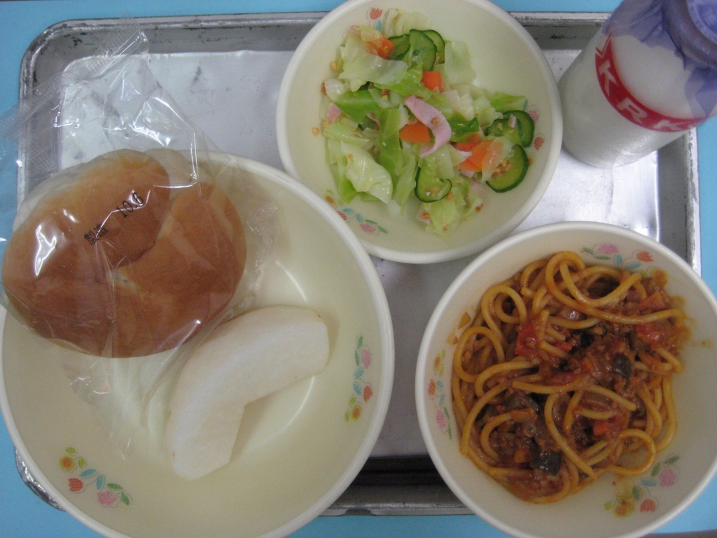 2013年12月2日 投稿日時 : 2013/12/03 ei/ho ☆ 米粉パン ☆ スパゲティナポリタン ☆ れんこんサラダ ☆ りんご 今日は、人気があるメニューのひとつ、スパゲティナポリタンでした。給食で出すことができるスパゲティの量では、エネルギーが不足するので、パンがつきます。全体的にやわらかい食事にならないように、噛みごたえのある「れんこんサラダ」と「りんご」を組み合わせました。