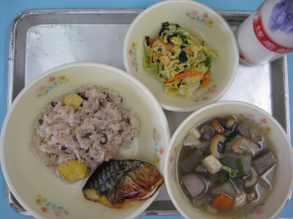 2013年10月9日 投稿日時 : 2013/10/09 ei/ho ☆ 栗入り赤飯 ☆ つぼん汁 ☆ 塩鯖 ☆ 五色和え 昨日、台風の影響で給食が中止になったため、昨日の献立を今日にずらしました。 今の時期、人吉市の青井阿蘇神社では「おくんち祭り」が行われます。そこで、祭りごとやお祝いごとに欠かせない料理である「赤飯」と「つぼん汁」を給食に登場させました。