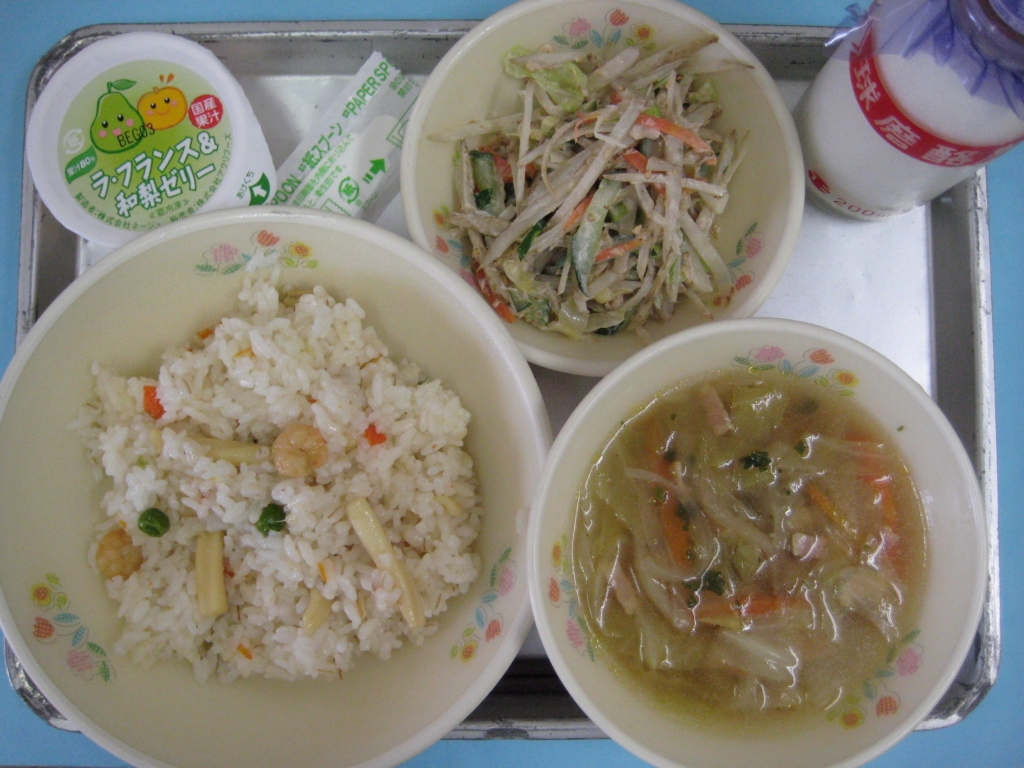 2013年10月3日 投稿日時 : 2013/10/03 ei/ho ☆ チャーハン ☆ うずら卵のスープ ☆ れんこんときゅうりのごまだれ ☆ バナナ 「れんこんときゅうりのごまだれ」は、かみごたえのある“かみかみメニュー”です。よくかむと、歯並びが良くなったり、むし歯を予防するなどの効果があります。