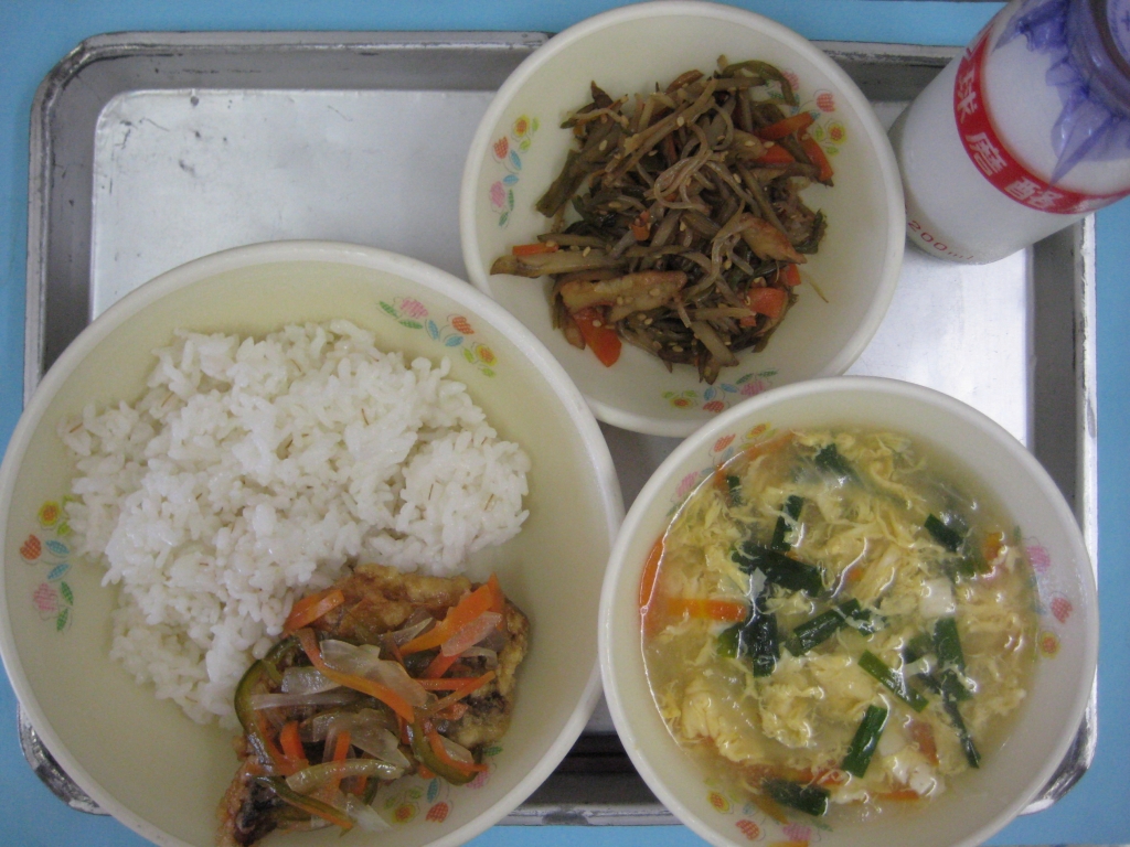 2013年10月22日 投稿日時 : 2013/10/22 ei/ho ☆ 麦ご飯 ☆ にら玉スープ ☆ あじの南蛮漬け ☆ かわりきんぴら 「かわりきんぴら」に使われている“ごぼう”や“くきわかめ”には、おなかの中をきれいに掃除してくれる働きをもつ“食物せんい”がたくさん含まれています。