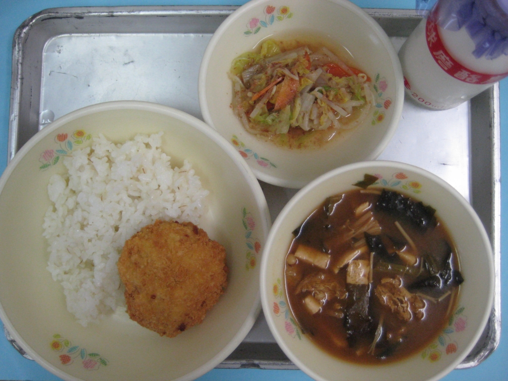 2013年10月24日 投稿日時 : 2013/10/24 ei/ho ☆ 麦ご飯 ☆ 赤だし ☆ 里芋の和風コロッケ ☆ 白菜のおかか和え 今日は、今が旬の「里芋」をたくさん使った「里芋の和風コロッケ」でした!里芋だけでなく、しめじ・たけのこ・チーズも入っていて、食べごたえのある具だくさんのコロッケです。
