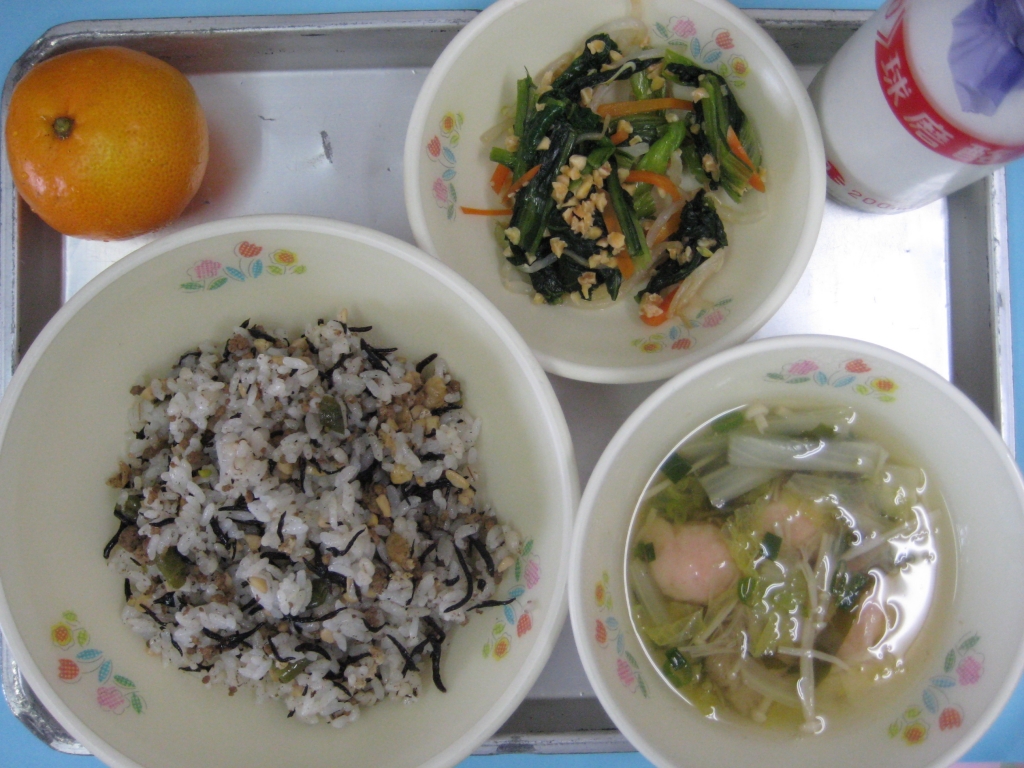 2013年12月13日 投稿日時 : 2013/12/13 ei/ho ☆ ゆかりご飯 ☆ しっぽくうどん ☆ 千草和え ☆ みかん 今日は、午後からお隣の湯前中学校で持久走大会があるとのことだったので、消化が良く、エネルギーになりやすいメニューにしました。