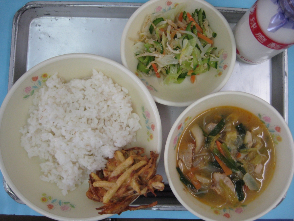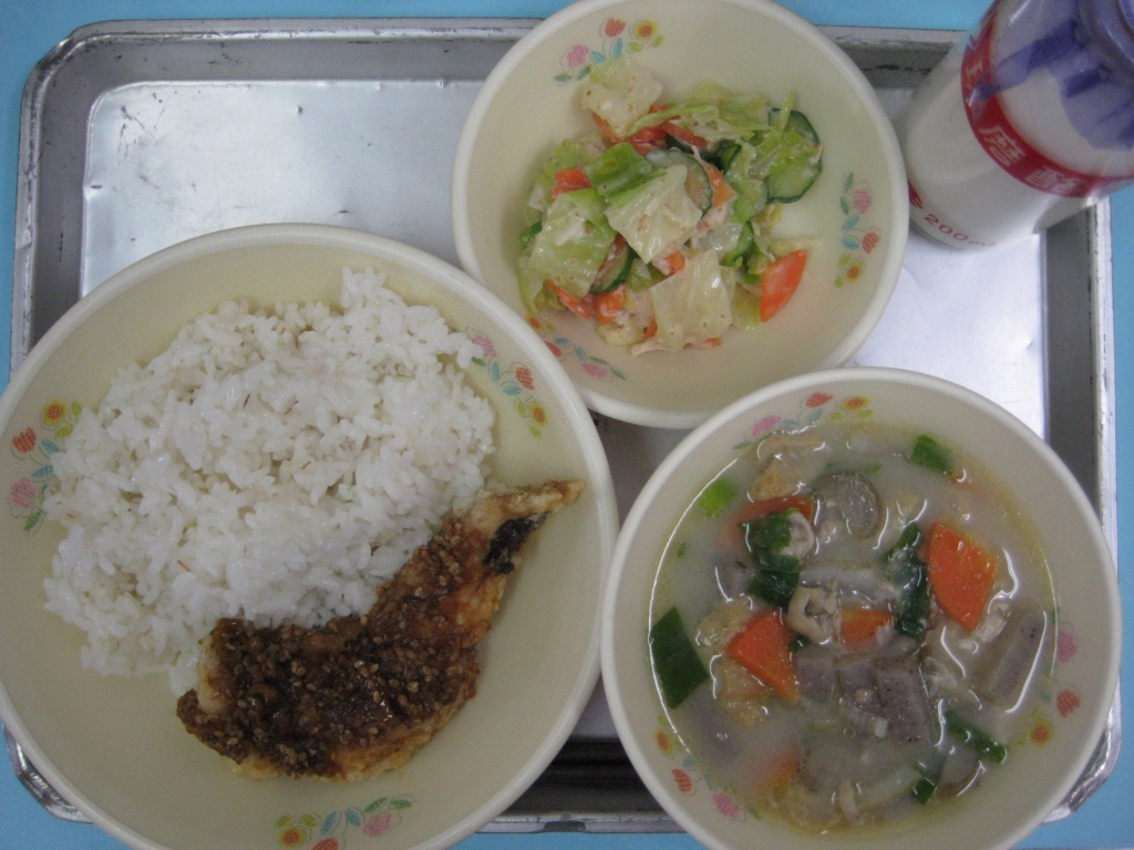 2013年11月28日 投稿日時 : 2013/11/28 ei/ho ☆ 麦ご飯 ☆ 鶏ごぼう汁 ☆ 魚のスタミナ揚げ ☆ 柚子ごまドレッシングサラダ 今日は、持久走大会がありました!寒い中、精一杯自分の力を発揮してくれたことと思います。 魚のスタミナ揚げは、体が温まり、ご飯が進むおかずです。しっかり食べて体の疲れを取りましょう!