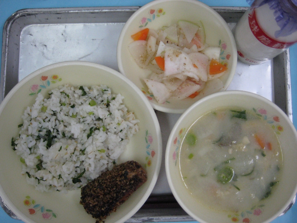 2013年11月19日 投稿日時 : 2013/11/19 ei/ho ☆ 菜飯 ☆ 呉汁 ☆ 鯖のごま衣焼き ☆ かぶのなます 今日は、熊本県内の地場産物や郷土料理について知る「ふるさとくまさんデー」です。これから旬をむかえる「かぶ」の紹介をしました。 また、4年生が育てた大根を給食用にいただいたので、大根の葉を使った「菜飯」と、大根をたくさん入れた「呉汁」を作りました。4年生のみなさん、ありがとうございました!
